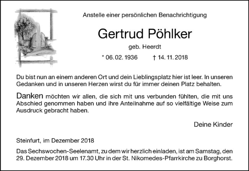 Hier finden Sie alle Traueranzeigen aus der Zeitung, die bisher für Gertrud Pöhlker erschienen sind. Weitere Traueranzeigen, die in der Zeitung erscheinen, werden hier ebenfalls aufgelistet
