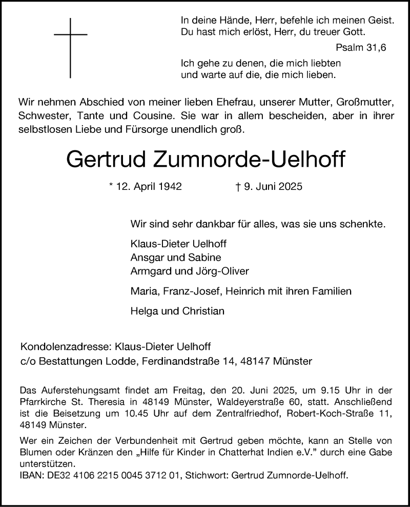 Hier finden Sie alle Traueranzeigen aus der Zeitung, die bisher für Gertrud Zumnorde-Uelhoff erschienen sind. Weitere Traueranzeigen, die in der Zeitung erscheinen, werden hier ebenfalls aufgelistet
