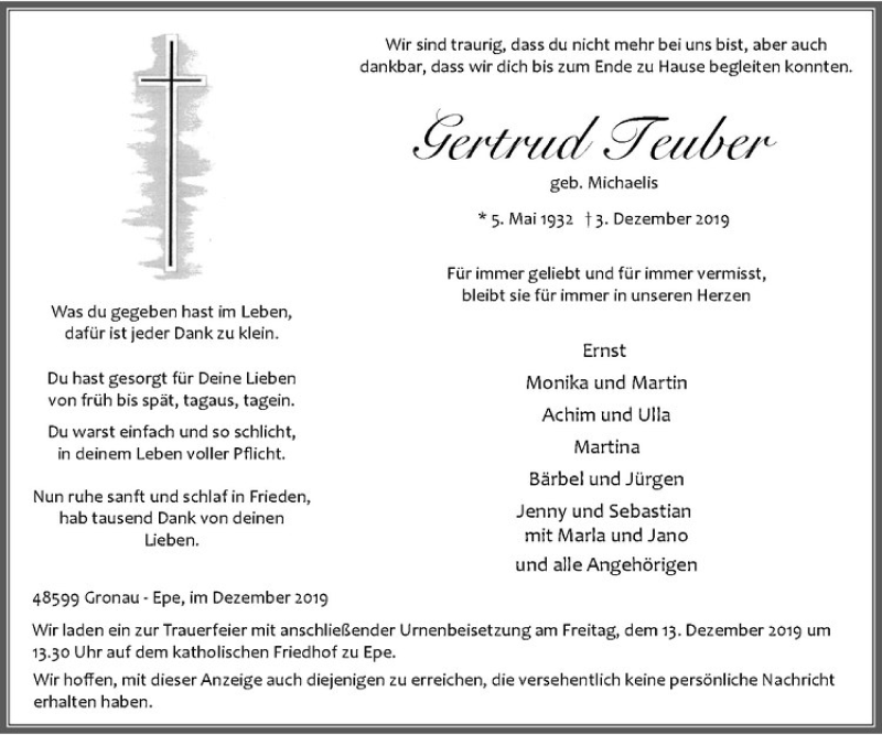 Hier finden Sie alle Traueranzeigen aus der Zeitung, die bisher für Gertud Teuber erschienen sind. Weitere Traueranzeigen, die in der Zeitung erscheinen, werden hier ebenfalls aufgelistet