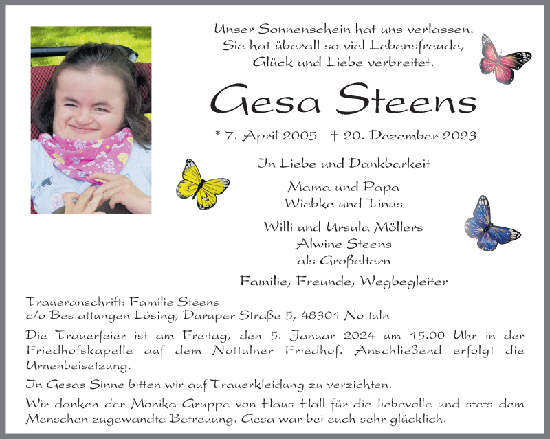 Hier finden Sie alle Traueranzeigen aus der Zeitung, die bisher für Gesa Steens erschienen sind. Weitere Traueranzeigen, die in der Zeitung erscheinen, werden hier ebenfalls aufgelistet