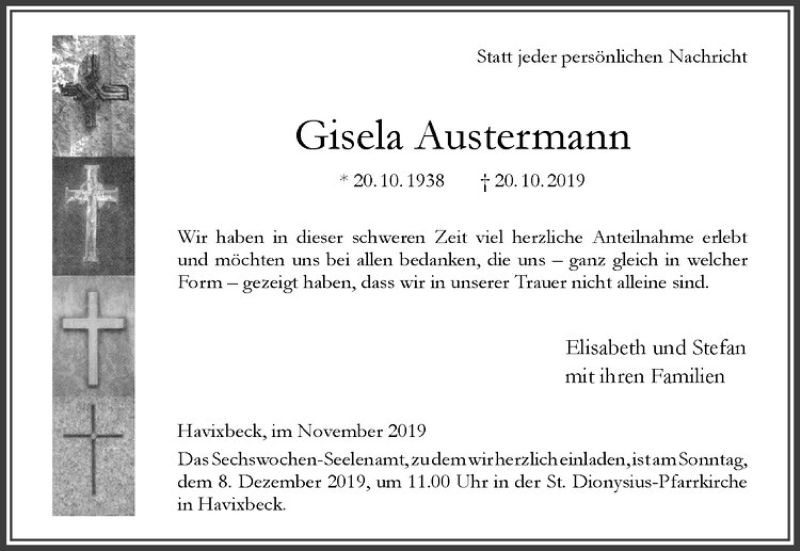 Hier finden Sie alle Traueranzeigen aus der Zeitung, die bisher für Gisela Austermann erschienen sind. Weitere Traueranzeigen, die in der Zeitung erscheinen, werden hier ebenfalls aufgelistet