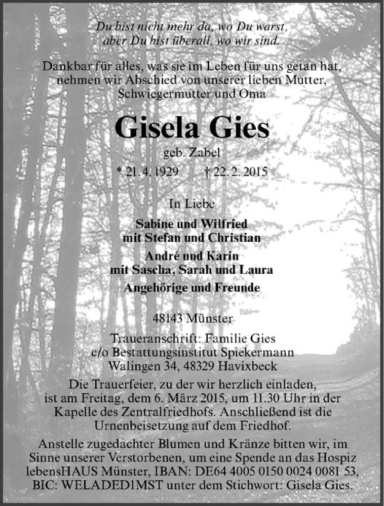Hier finden Sie alle Traueranzeigen aus der Zeitung, die bisher für Gisela Gies erschienen sind. Weitere Traueranzeigen, die in der Zeitung erscheinen, werden hier ebenfalls aufgelistet