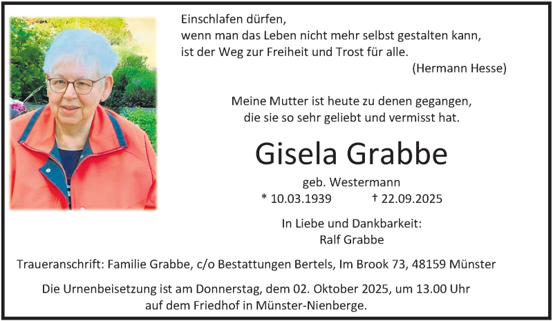 Hier finden Sie alle Traueranzeigen aus der Zeitung, die bisher für Gisela Grabbe erschienen sind. Weitere Traueranzeigen, die in der Zeitung erscheinen, werden hier ebenfalls aufgelistet