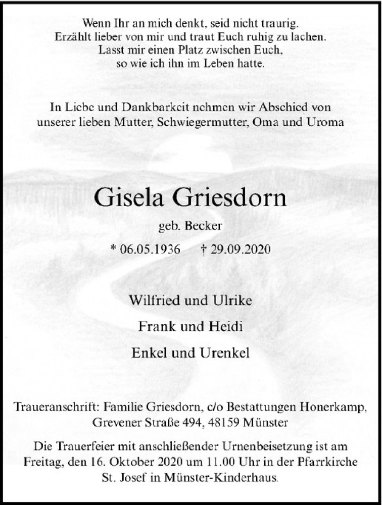 Hier finden Sie alle Traueranzeigen aus der Zeitung, die bisher für Gisela Griesdorn erschienen sind. Weitere Traueranzeigen, die in der Zeitung erscheinen, werden hier ebenfalls aufgelistet