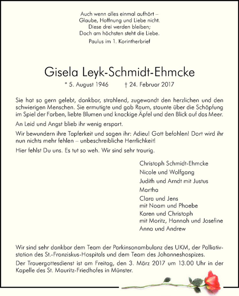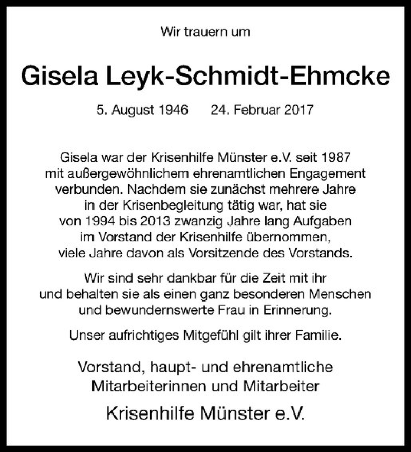 Hier finden Sie alle Traueranzeigen aus der Zeitung, die bisher für Gisela Leyk-Schmidt-Ehmcke erschienen sind. Weitere Traueranzeigen, die in der Zeitung erscheinen, werden hier ebenfalls aufgelistet