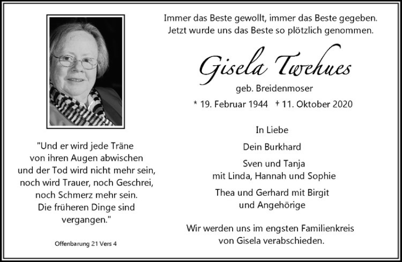 Hier finden Sie alle Traueranzeigen aus der Zeitung, die bisher für Gisela Twehues erschienen sind. Weitere Traueranzeigen, die in der Zeitung erscheinen, werden hier ebenfalls aufgelistet