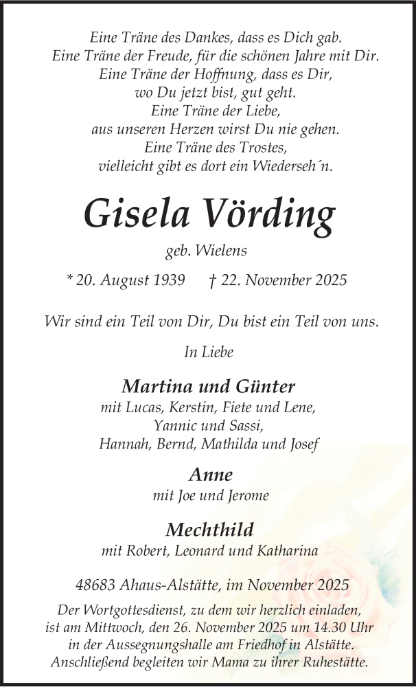 Hier finden Sie alle Traueranzeigen aus der Zeitung, die bisher für Gisela Vörding erschienen sind. Weitere Traueranzeigen, die in der Zeitung erscheinen, werden hier ebenfalls aufgelistet