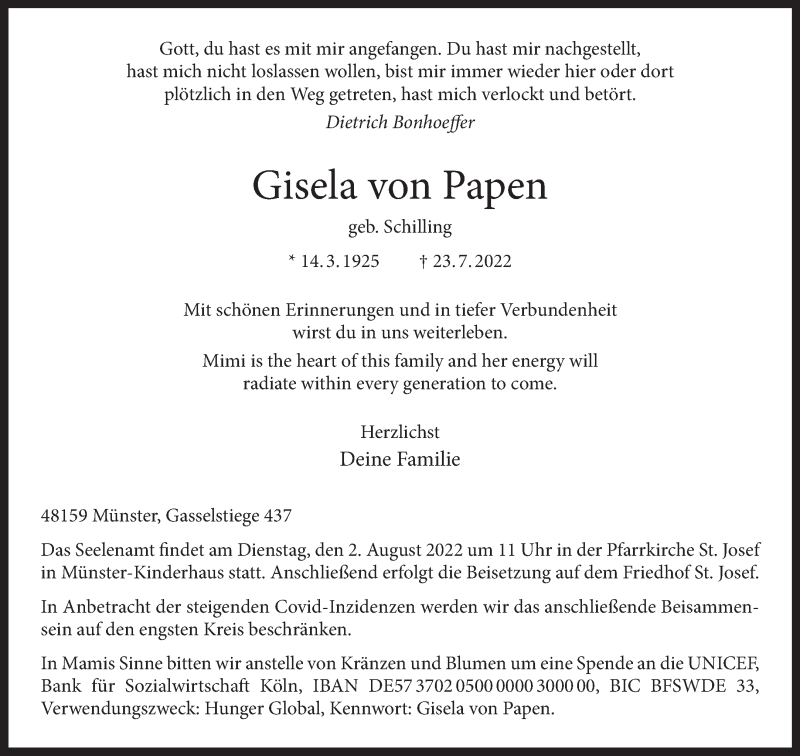 Hier finden Sie alle Traueranzeigen aus der Zeitung, die bisher für Gisela von Papen erschienen sind. Weitere Traueranzeigen, die in der Zeitung erscheinen, werden hier ebenfalls aufgelistet