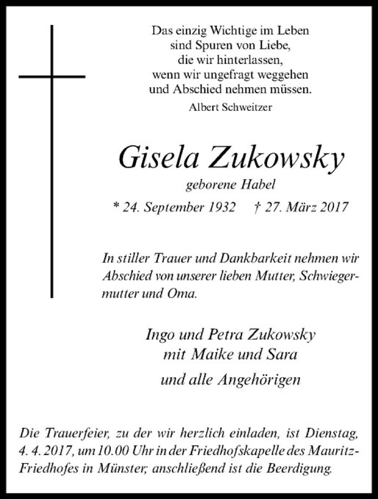 Hier finden Sie alle Traueranzeigen aus der Zeitung, die bisher für Gisela Zukowsky erschienen sind. Weitere Traueranzeigen, die in der Zeitung erscheinen, werden hier ebenfalls aufgelistet