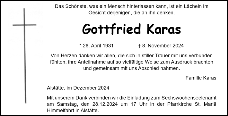 Hier finden Sie alle Traueranzeigen aus der Zeitung, die bisher für Gottfried Karas erschienen sind. Weitere Traueranzeigen, die in der Zeitung erscheinen, werden hier ebenfalls aufgelistet