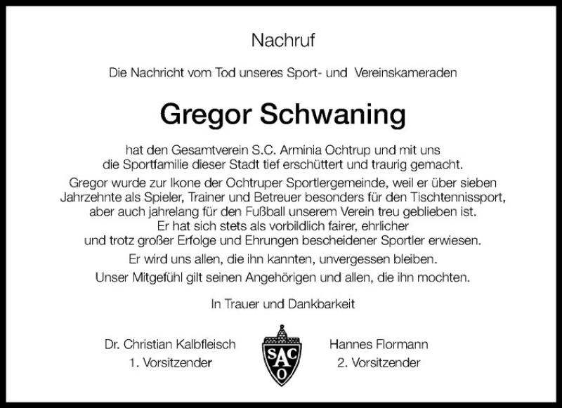 Hier finden Sie alle Traueranzeigen aus der Zeitung, die bisher für Gregor Schwaning erschienen sind. Weitere Traueranzeigen, die in der Zeitung erscheinen, werden hier ebenfalls aufgelistet