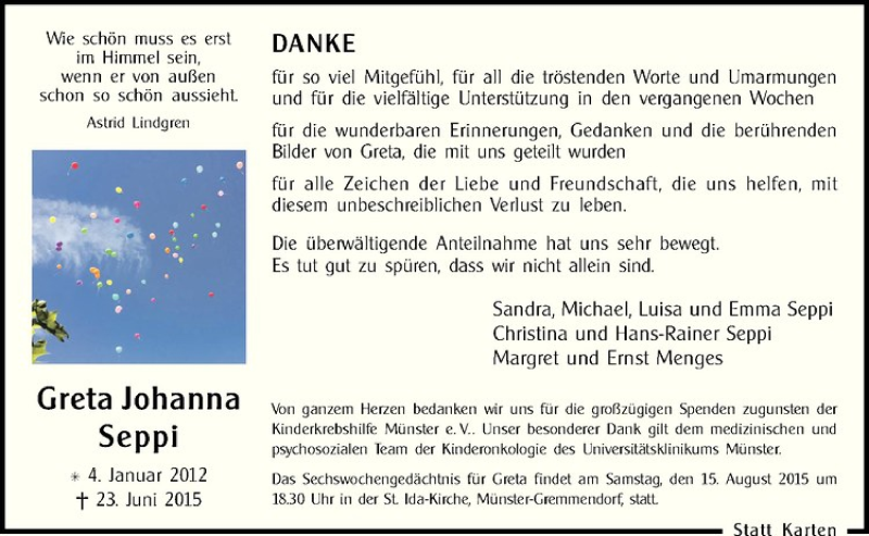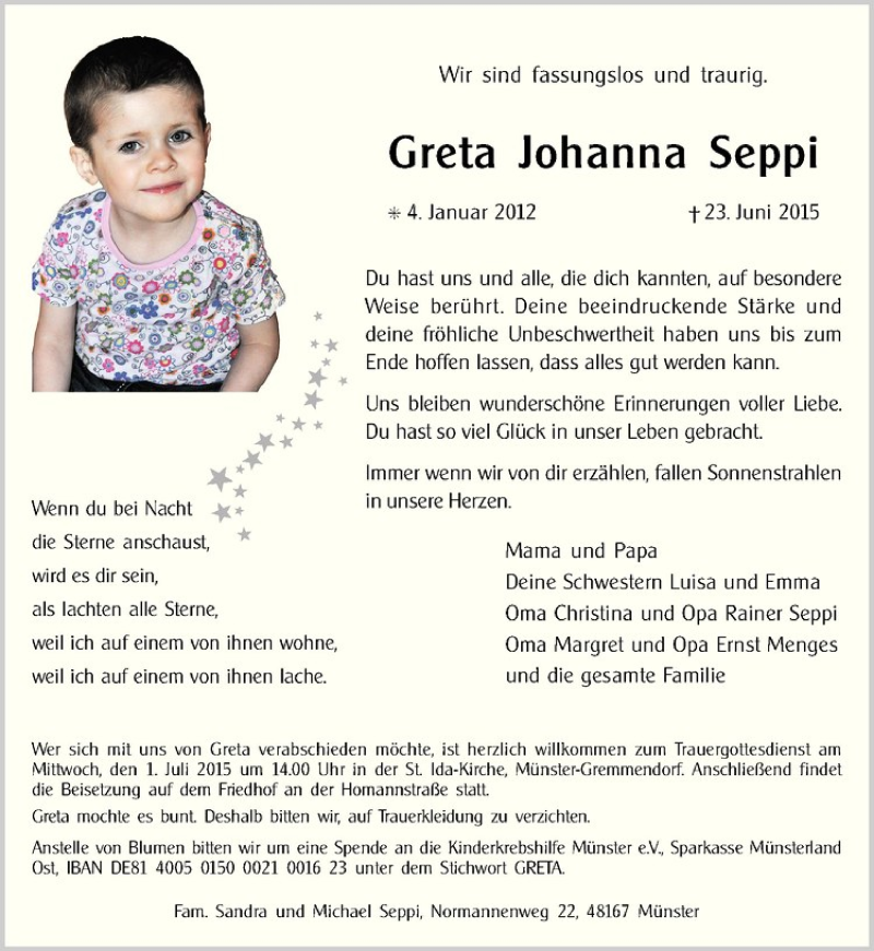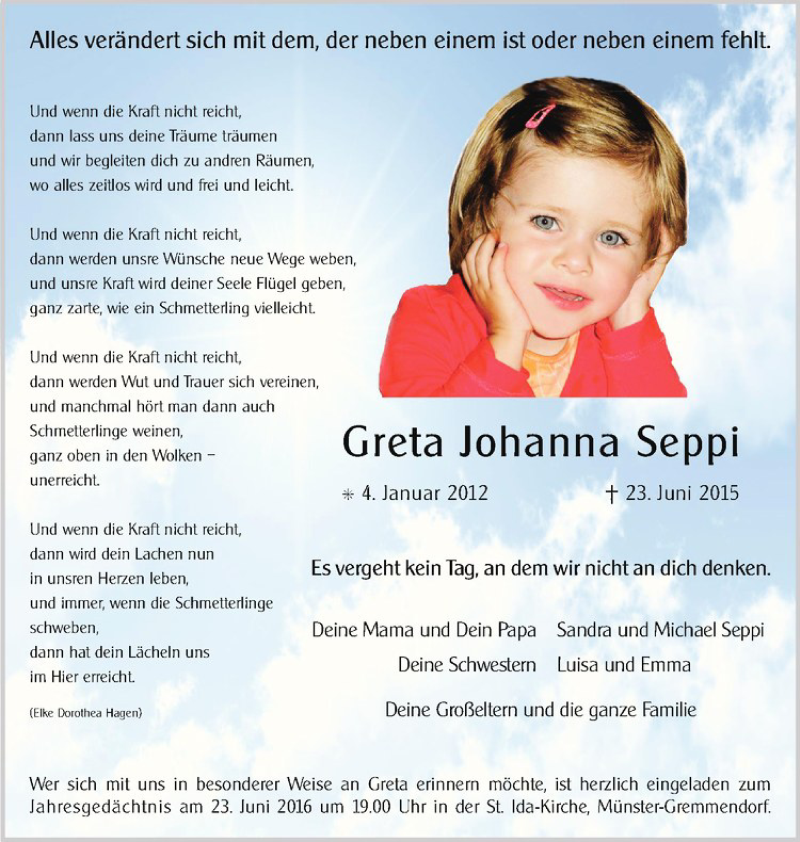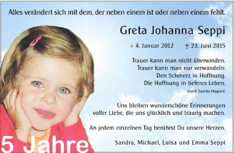 Hier finden Sie alle Traueranzeigen aus der Zeitung, die bisher für Greta Johanna Seppi erschienen sind. Weitere Traueranzeigen, die in der Zeitung erscheinen, werden hier ebenfalls aufgelistet
