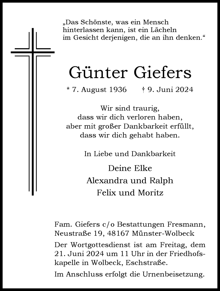 Hier finden Sie alle Traueranzeigen aus der Zeitung, die bisher für Günter Giefers erschienen sind. Weitere Traueranzeigen, die in der Zeitung erscheinen, werden hier ebenfalls aufgelistet