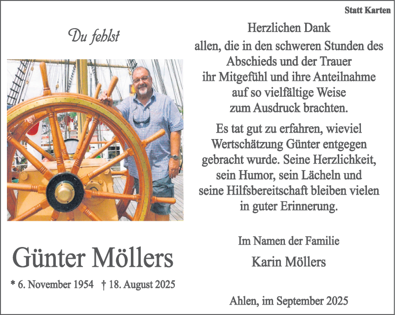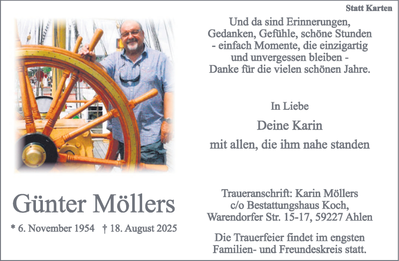 Hier finden Sie alle Traueranzeigen aus der Zeitung, die bisher für Günter Möllers erschienen sind. Weitere Traueranzeigen, die in der Zeitung erscheinen, werden hier ebenfalls aufgelistet