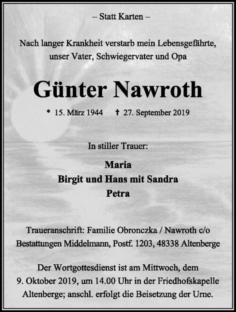Hier finden Sie alle Traueranzeigen aus der Zeitung, die bisher für Günter Nawroth erschienen sind. Weitere Traueranzeigen, die in der Zeitung erscheinen, werden hier ebenfalls aufgelistet