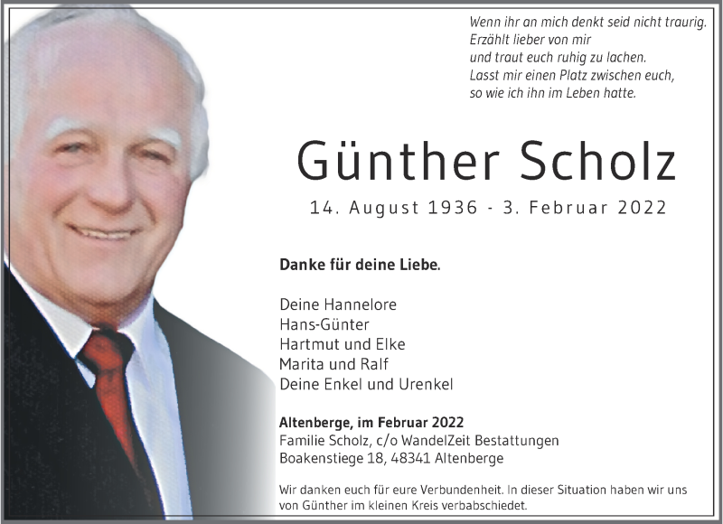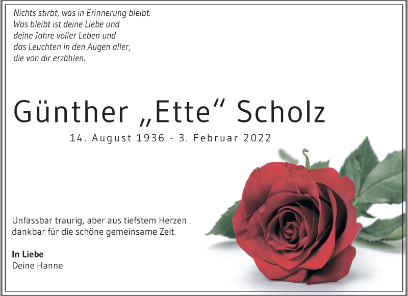 Hier finden Sie alle Traueranzeigen aus der Zeitung, die bisher für Günther Scholz erschienen sind. Weitere Traueranzeigen, die in der Zeitung erscheinen, werden hier ebenfalls aufgelistet