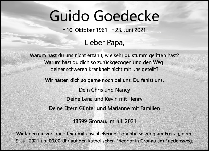 Hier finden Sie alle Traueranzeigen aus der Zeitung, die bisher für Guido Goedeke erschienen sind. Weitere Traueranzeigen, die in der Zeitung erscheinen, werden hier ebenfalls aufgelistet
