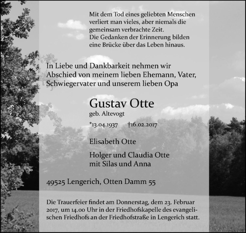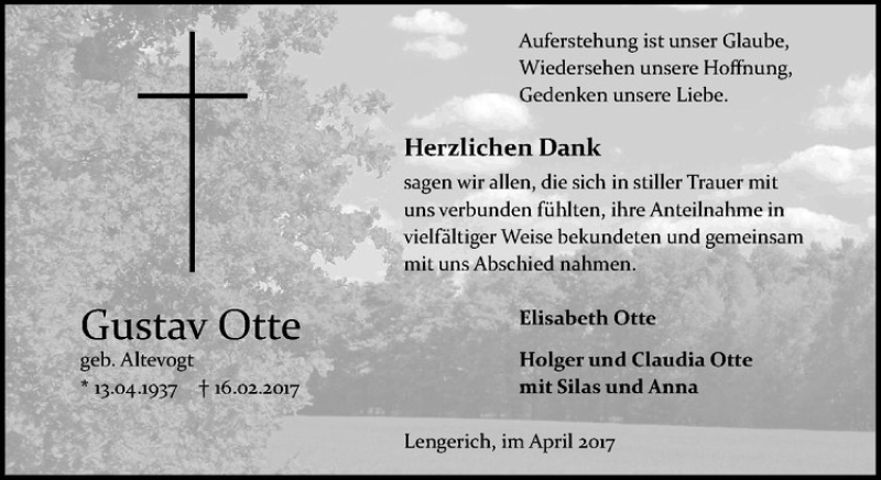 Hier finden Sie alle Traueranzeigen aus der Zeitung, die bisher für Gustav Otte erschienen sind. Weitere Traueranzeigen, die in der Zeitung erscheinen, werden hier ebenfalls aufgelistet
