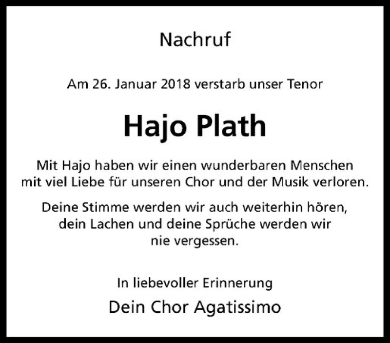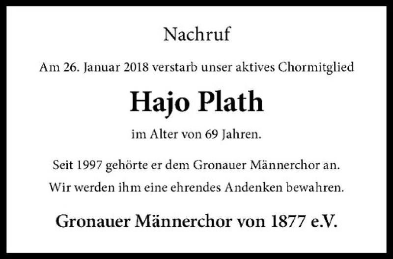 Hier finden Sie alle Traueranzeigen aus der Zeitung, die bisher für Hajo Plath erschienen sind. Weitere Traueranzeigen, die in der Zeitung erscheinen, werden hier ebenfalls aufgelistet