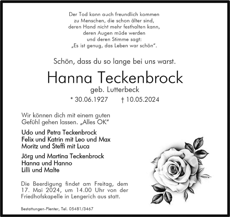 Hier finden Sie alle Traueranzeigen aus der Zeitung, die bisher für Hanna Teckenbrock erschienen sind. Weitere Traueranzeigen, die in der Zeitung erscheinen, werden hier ebenfalls aufgelistet