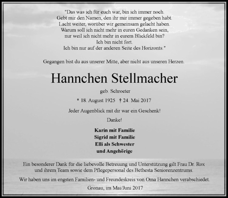 Hier finden Sie alle Traueranzeigen aus der Zeitung, die bisher für Hannchen Stellmacher erschienen sind. Weitere Traueranzeigen, die in der Zeitung erscheinen, werden hier ebenfalls aufgelistet