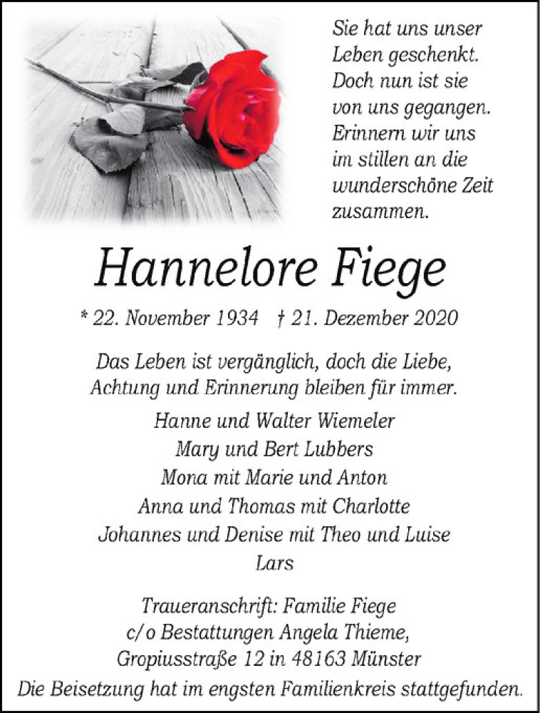 Hier finden Sie alle Traueranzeigen aus der Zeitung, die bisher für Hannelore Fiege erschienen sind. Weitere Traueranzeigen, die in der Zeitung erscheinen, werden hier ebenfalls aufgelistet