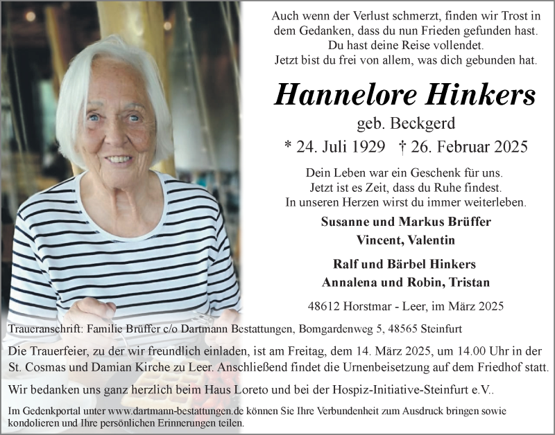 Hier finden Sie alle Traueranzeigen aus der Zeitung, die bisher für Hannelore Hinkers erschienen sind. Weitere Traueranzeigen, die in der Zeitung erscheinen, werden hier ebenfalls aufgelistet