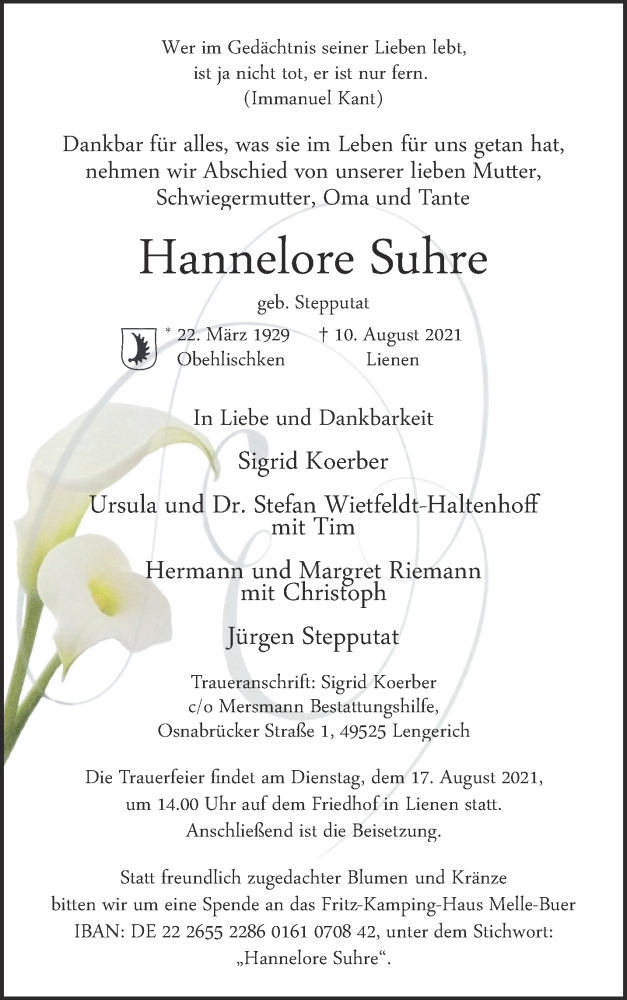 Hier finden Sie alle Traueranzeigen aus der Zeitung, die bisher für Hannelore Suhre erschienen sind. Weitere Traueranzeigen, die in der Zeitung erscheinen, werden hier ebenfalls aufgelistet