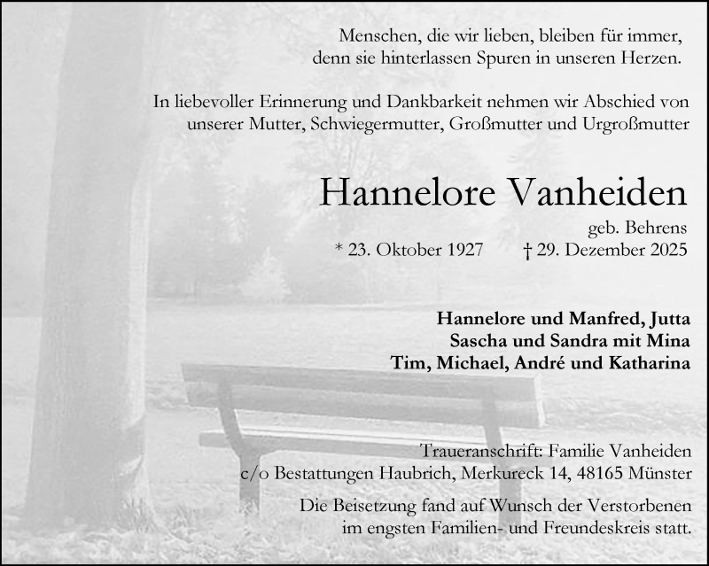 Hier finden Sie alle Traueranzeigen aus der Zeitung, die bisher für Hannelore Vanheiden erschienen sind. Weitere Traueranzeigen, die in der Zeitung erscheinen, werden hier ebenfalls aufgelistet