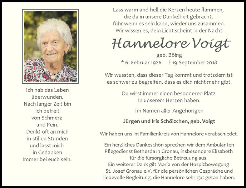 Hier finden Sie alle Traueranzeigen aus der Zeitung, die bisher für Hannelore Voigt erschienen sind. Weitere Traueranzeigen, die in der Zeitung erscheinen, werden hier ebenfalls aufgelistet