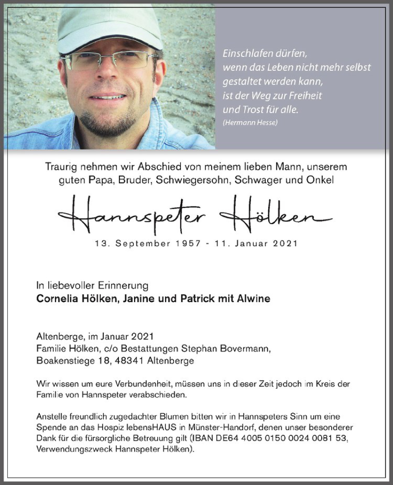 Hier finden Sie alle Traueranzeigen aus der Zeitung, die bisher für Hannspeter Hölken erschienen sind. Weitere Traueranzeigen, die in der Zeitung erscheinen, werden hier ebenfalls aufgelistet