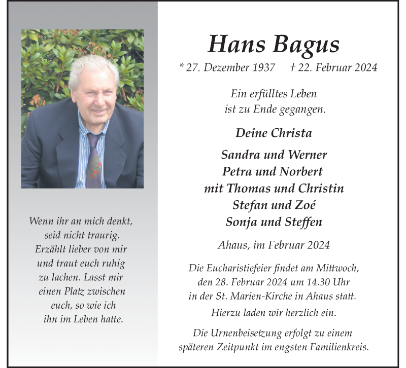 Hier finden Sie alle Traueranzeigen aus der Zeitung, die bisher für Hans Bagus erschienen sind. Weitere Traueranzeigen, die in der Zeitung erscheinen, werden hier ebenfalls aufgelistet