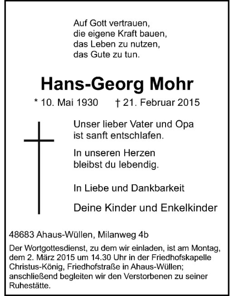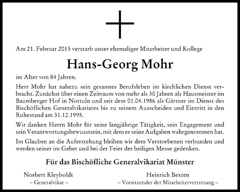Hier finden Sie alle Traueranzeigen aus der Zeitung, die bisher für Hans-Georg Mohr erschienen sind. Weitere Traueranzeigen, die in der Zeitung erscheinen, werden hier ebenfalls aufgelistet