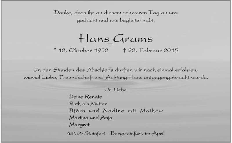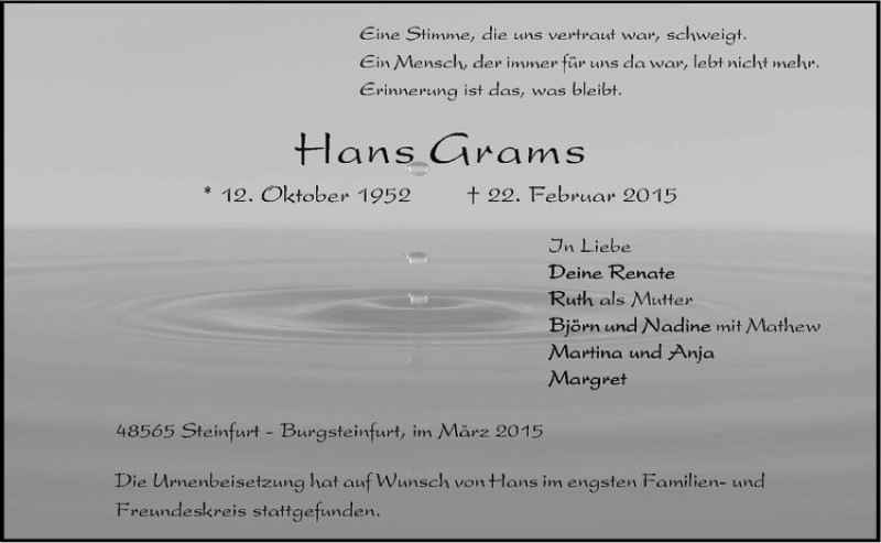 Hier finden Sie alle Traueranzeigen aus der Zeitung, die bisher für Hans Grams erschienen sind. Weitere Traueranzeigen, die in der Zeitung erscheinen, werden hier ebenfalls aufgelistet