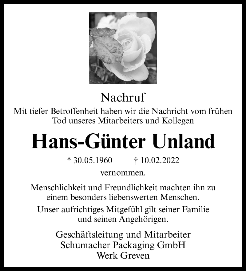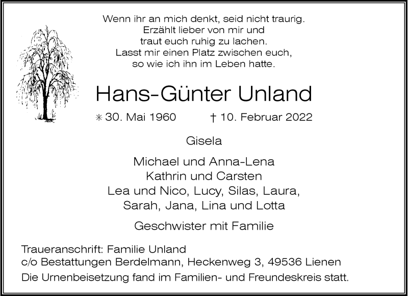 Hier finden Sie alle Traueranzeigen aus der Zeitung, die bisher für Hans-Günter Unland erschienen sind. Weitere Traueranzeigen, die in der Zeitung erscheinen, werden hier ebenfalls aufgelistet