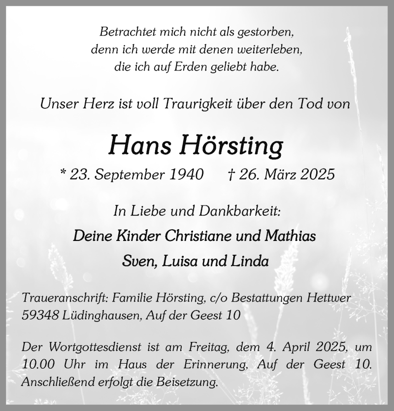 Hier finden Sie alle Traueranzeigen aus der Zeitung, die bisher für Hans Hörsting erschienen sind. Weitere Traueranzeigen, die in der Zeitung erscheinen, werden hier ebenfalls aufgelistet