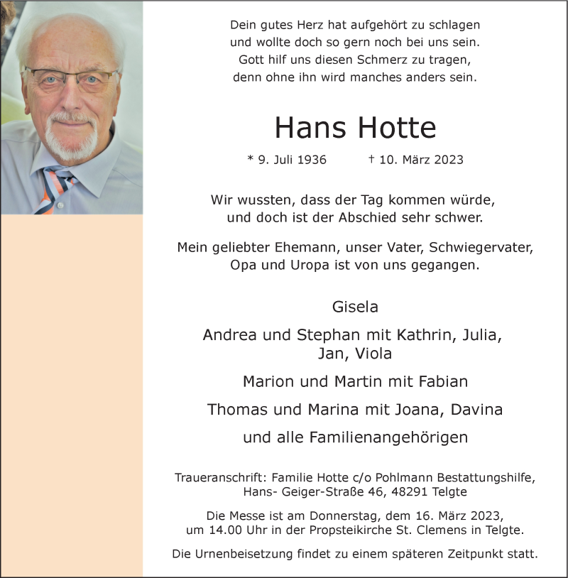 Hier finden Sie alle Traueranzeigen aus der Zeitung, die bisher für Hans Hotte erschienen sind. Weitere Traueranzeigen, die in der Zeitung erscheinen, werden hier ebenfalls aufgelistet