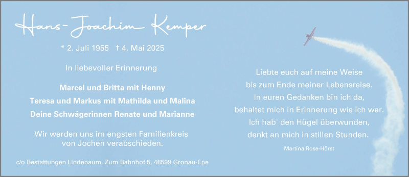 Hier finden Sie alle Traueranzeigen aus der Zeitung, die bisher für Hans-Joachim Kemper erschienen sind. Weitere Traueranzeigen, die in der Zeitung erscheinen, werden hier ebenfalls aufgelistet