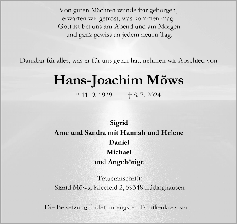 Hier finden Sie alle Traueranzeigen aus der Zeitung, die bisher für Hans-Joachim Möws erschienen sind. Weitere Traueranzeigen, die in der Zeitung erscheinen, werden hier ebenfalls aufgelistet