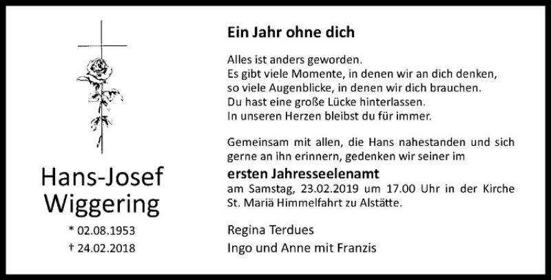 Hier finden Sie alle Traueranzeigen aus der Zeitung, die bisher für Hans-Josef Wiggering erschienen sind. Weitere Traueranzeigen, die in der Zeitung erscheinen, werden hier ebenfalls aufgelistet