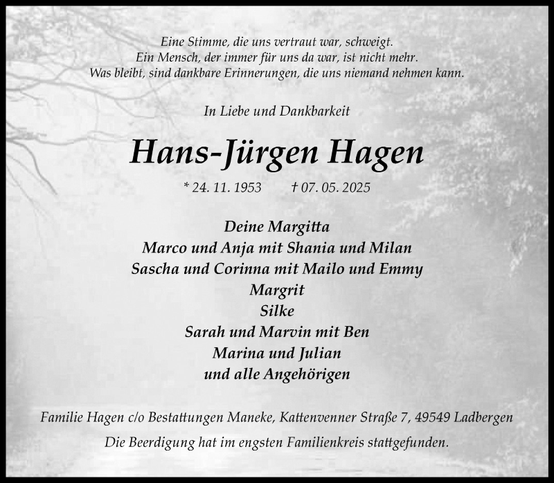 Hier finden Sie alle Traueranzeigen aus der Zeitung, die bisher für Hans-Jürgen Hagen erschienen sind. Weitere Traueranzeigen, die in der Zeitung erscheinen, werden hier ebenfalls aufgelistet