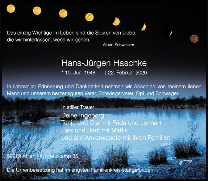 Hier finden Sie alle Traueranzeigen aus der Zeitung, die bisher für Hans-Jürgen Haschke erschienen sind. Weitere Traueranzeigen, die in der Zeitung erscheinen, werden hier ebenfalls aufgelistet