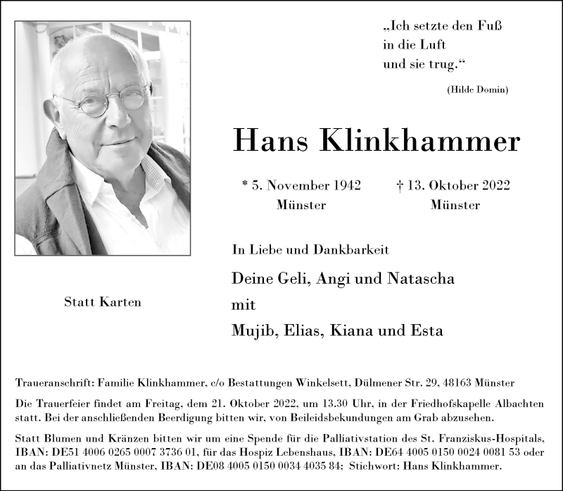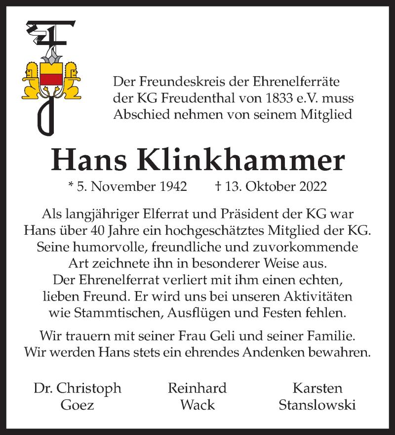 Hier finden Sie alle Traueranzeigen aus der Zeitung, die bisher für Hans Klinkhammer erschienen sind. Weitere Traueranzeigen, die in der Zeitung erscheinen, werden hier ebenfalls aufgelistet