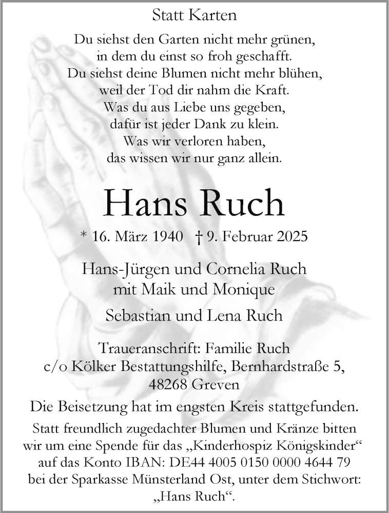 Hier finden Sie alle Traueranzeigen aus der Zeitung, die bisher für Hans Ruch erschienen sind. Weitere Traueranzeigen, die in der Zeitung erscheinen, werden hier ebenfalls aufgelistet