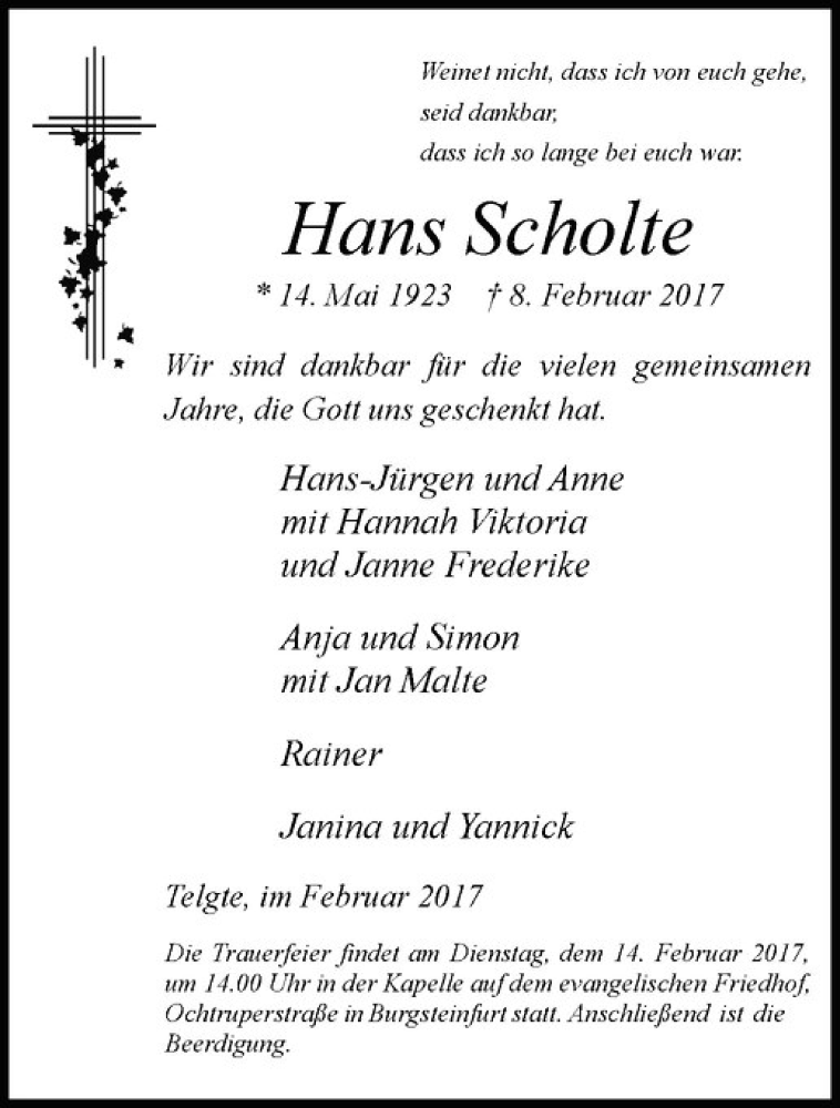 Hier finden Sie alle Traueranzeigen aus der Zeitung, die bisher für Hans Scholte erschienen sind. Weitere Traueranzeigen, die in der Zeitung erscheinen, werden hier ebenfalls aufgelistet