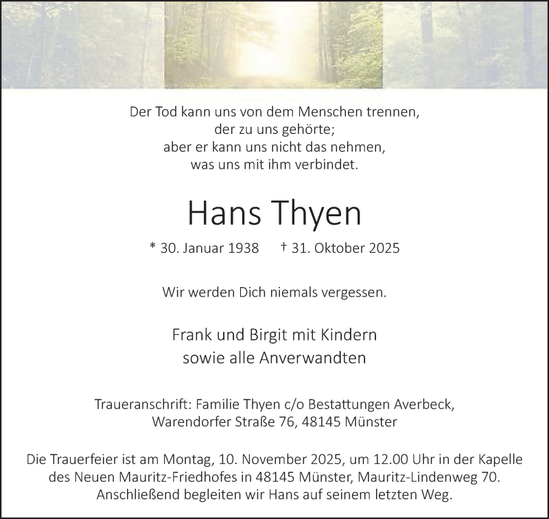 Hier finden Sie alle Traueranzeigen aus der Zeitung, die bisher für Hans Thyen erschienen sind. Weitere Traueranzeigen, die in der Zeitung erscheinen, werden hier ebenfalls aufgelistet