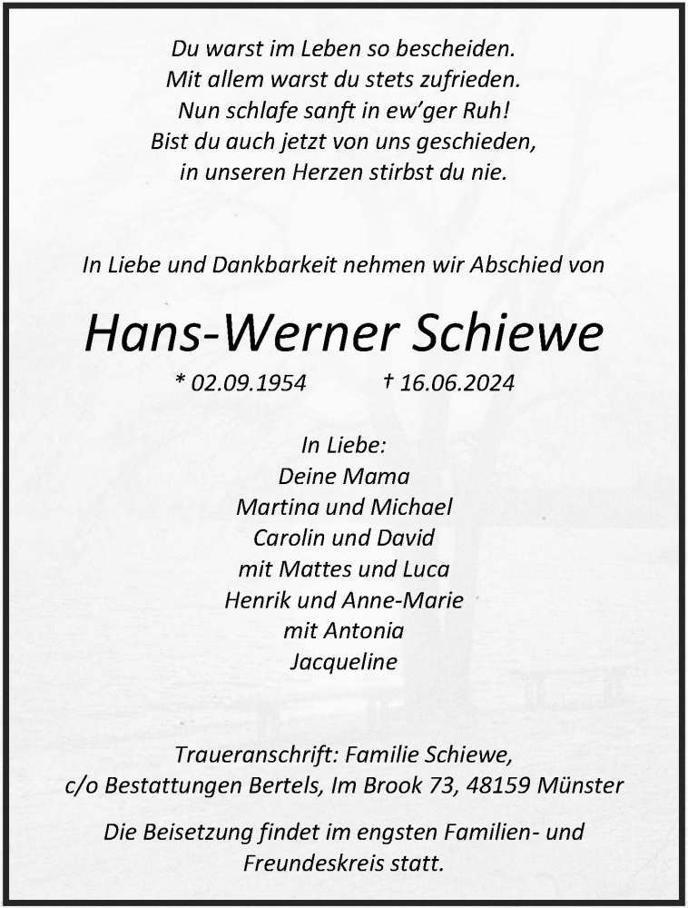 Hier finden Sie alle Traueranzeigen aus der Zeitung, die bisher für Hans-Werner Schiewe erschienen sind. Weitere Traueranzeigen, die in der Zeitung erscheinen, werden hier ebenfalls aufgelistet