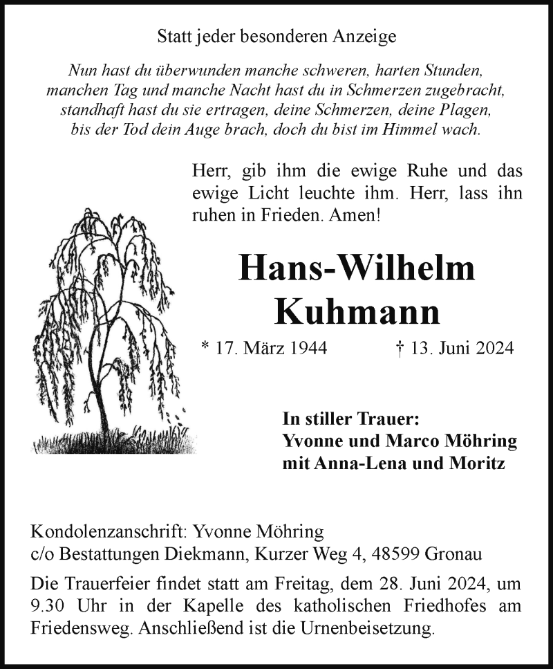 Hier finden Sie alle Traueranzeigen aus der Zeitung, die bisher für Hans-Wilhelm Kuhmann erschienen sind. Weitere Traueranzeigen, die in der Zeitung erscheinen, werden hier ebenfalls aufgelistet