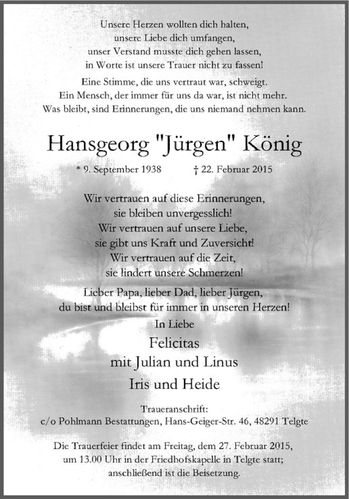 Hier finden Sie alle Traueranzeigen aus der Zeitung, die bisher für Hansgeorg König erschienen sind. Weitere Traueranzeigen, die in der Zeitung erscheinen, werden hier ebenfalls aufgelistet