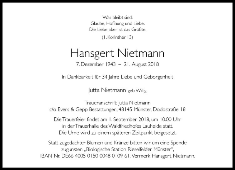 Hier finden Sie alle Traueranzeigen aus der Zeitung, die bisher für Hansgert Nietmann erschienen sind. Weitere Traueranzeigen, die in der Zeitung erscheinen, werden hier ebenfalls aufgelistet